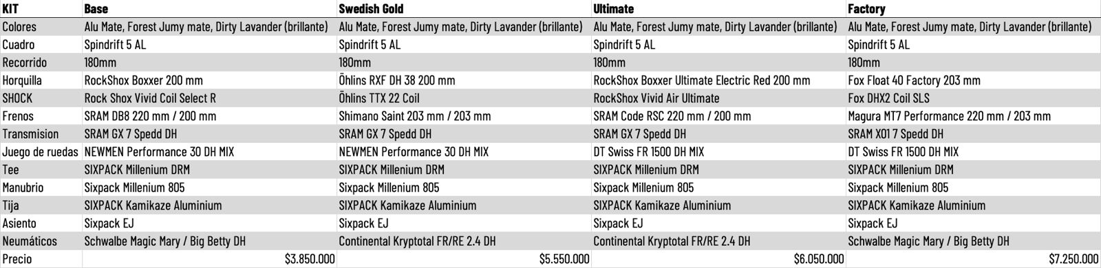 Con la Spindrift 5 AL, ofrecemos una bicicleta de freeride fiable, robusta y duradera que puede configurarse en dos variantes basadas en una plataforma con 180 mm de recorrido en la parte trasera. La versión Single Crown con 180 mm de recorrido en la parte delantera y varias opciones de transmisión para la acción cuesta arriba y la versión Dual Crown con 200 mm en la parte delantera y transmisión DH de 7 velocidades. El doble puente convierte a la Spindrift 5 AL en un arma de bike park y completa nuestra gama con otra bicicleta de park.