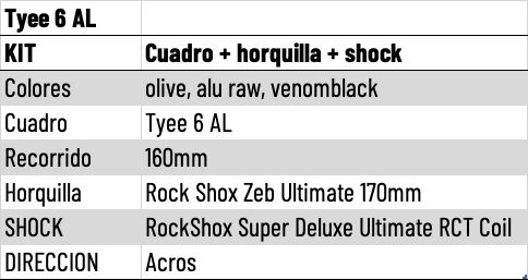 La versión de aluminio estará disponible en los colores «Alu Raw (mate)», «Venomblack (mate)» y «Olive (brillante)». El color del marco «oliva» tiene su debut en PROPAIN y se puede combinar perfectamente con todas las opciones de especificaciones. El Alu Raw tiene un sello especial y destaca por su elegante acabado mate. Venomblack, nuestro negro mate, ahora está disponible en la Tyee.